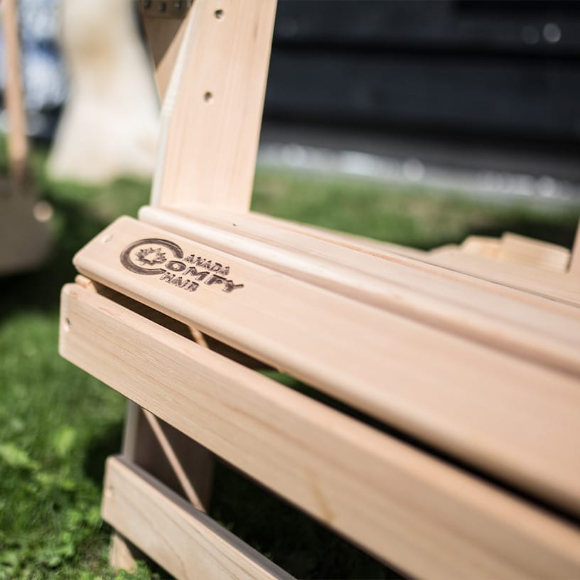 The wooden Comfy Chair Original is a luxurious adirondack chair from Canada. The classic model has been extended with an extra-deep seat and large, wide armrests. As a result, this adirondack is very comfortable for tall people too. The parts of the chair are sawn from whole red cedar planks. Thanks to this method, the wood has beautiful, natural colour shades. Every wooden Comfy Chair is therefore 100% unique.
